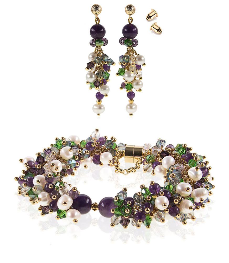 Das prachtvolle Potpourri vereint Amethyst, Glaskristalle und Süßwasserzuchtperle in beste Qualität. Schillernde Nuancen aus Smaragdgrün, hellblau, lila und klarer Glaskristalle, weiße Perlen verzaubern jeden Betrachter. Kombinieren Sie dazu der passende Armband für glamouröse Momente. Dieser Schmuck wird im MAGIC-PEARLS Atelier handgefertigt. Jedes Schmuckstück mit Unikatcharakter.