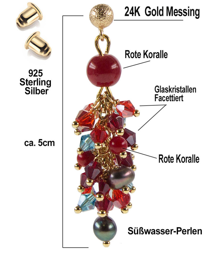 Rote Koralle, Süßwasserperlen, Glaskristallen, 14K und 24K vergoldetes Messing.