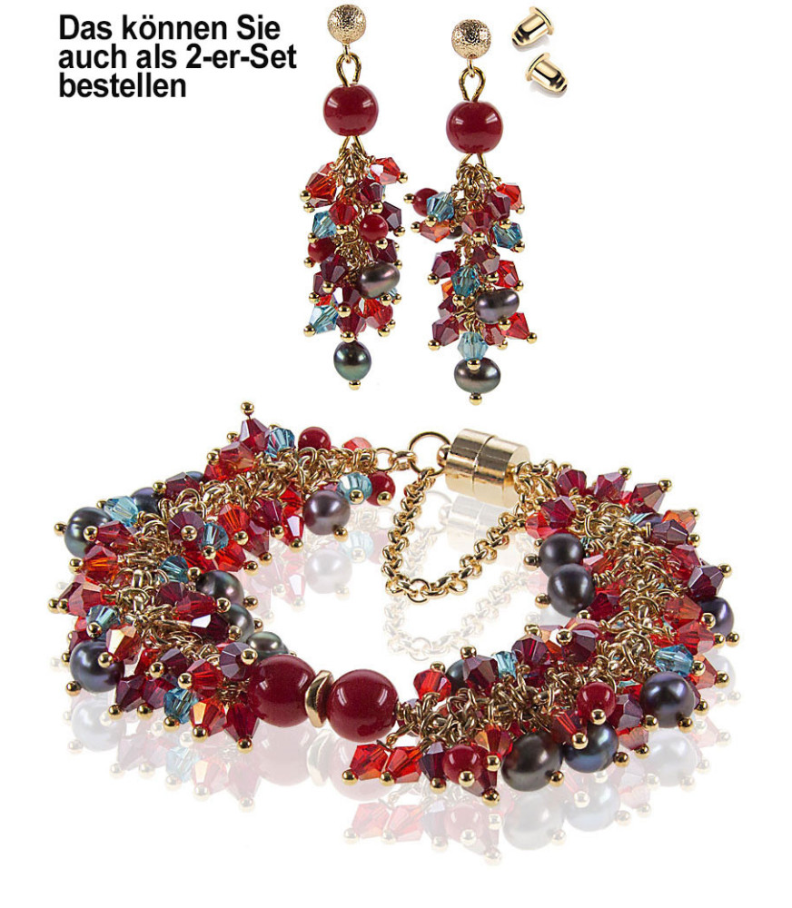 Fulminantes Schmuckstück für glanzvolle Auftritte! Das prachtvolle Potpourri vereint Glaskristalle und Süßwasserzuchtperlen in beste Qualität. Schillernde Nuancen aus Himmel-Blau, Rot, Bordeaux und Grau verzaubern jeden Betrachter. Kombinieren Sie dazu der passende Armband für glamouröse Momente. Dieser Schmuck wird im MAGIC-PEARLS Atelier handgefertigt. Jedes Schmuckstück mit Unikatcharakter.