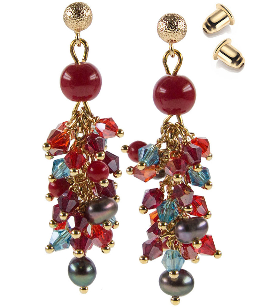 Beeindruckende Ohrringe mit Süßwasserperlen, natürliche Koralle, Glaskristalle, 14K Gold