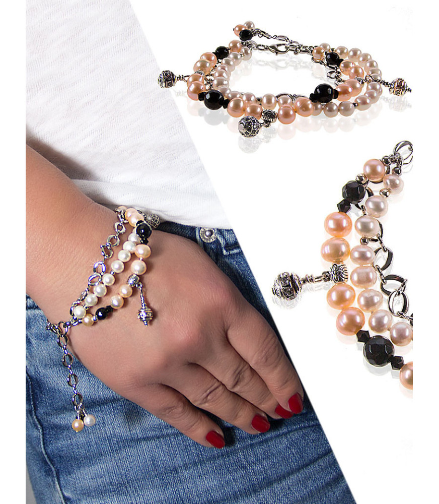 Pulsera de perlas cultivadas de agua dulce de 3 hileras con gema ónix, blanco/rosa 6-8 mm