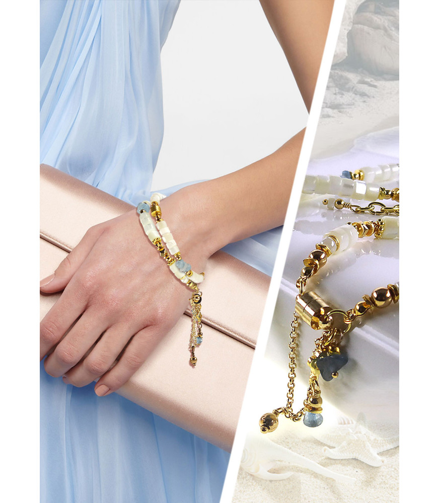 Pulsera de nácar vibrante y estilosa hecha de una aleación de oro, chapada en oro amarillo de 14K-24K, nácar natural AAA y morganita azul irregular natural. Morganita. Con altos estándares en nuestro taller de joyería fabricada, siempre diseñada en forma y color para adaptarse a las tendencias de diseño de joyas. También puedes pedir una pulsera o pendientes a juego. Esta joya está hecha a mano en nuestro taller de joyería. Cada pieza es única.