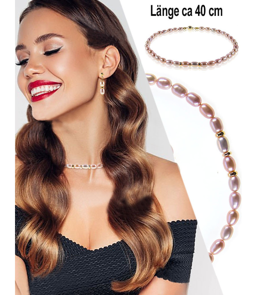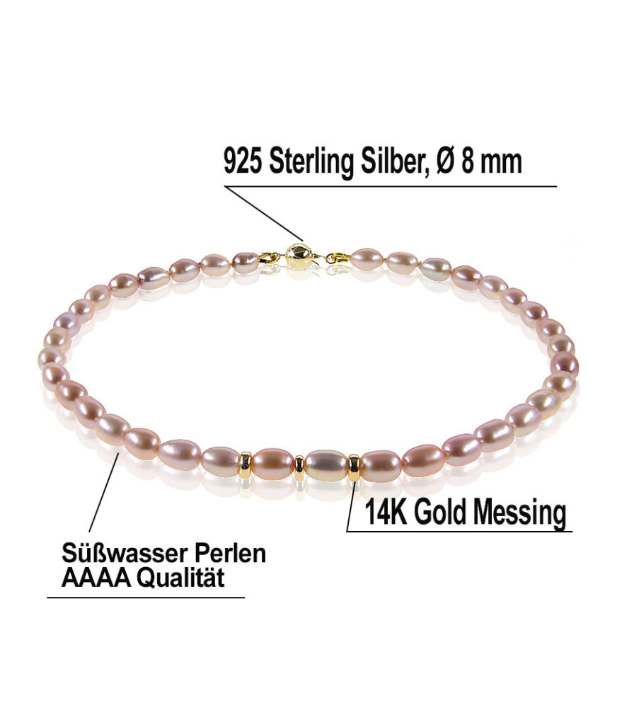 Perlas-El collar de perlas es una excelente opción para cualquier ocasión y atuendo. Esto también se aplica a este collar de perlas de 925 plata esterlina en oro, adornado con numerosas perlas ovales de color lila de 9 a 10 mm de diámetro. Las perlas de cultivo de agua dulce son seleccionadas a mano y todas son únicas. Esta moderna reinterpretación del clásico collar de perlas se muestra perfecta y radiante, resaltando la belleza atemporal de los tesoros marinos.