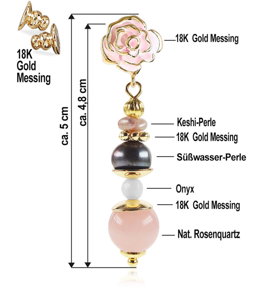 Pendientes de oro rosa de 18K con perlas de agua dulce, cuarzo rosa, ónix