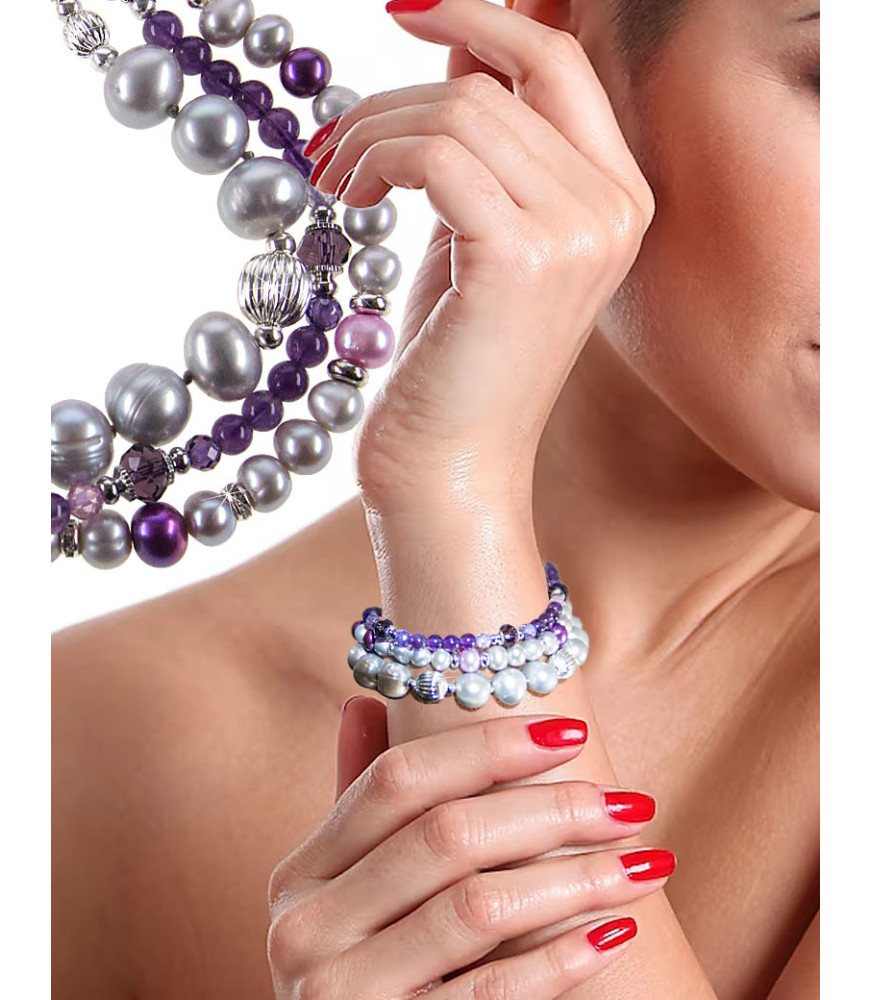 Cristaux chatoyants de différentes couleurs et formes, perles d'eau douce en gris, violet et rose, ainsi que pierre précieuse améthyste confèrent à ce bracelet une touche d'extravagance. Associez-le avec les boucles d'oreilles assorties pour des moments glamour.