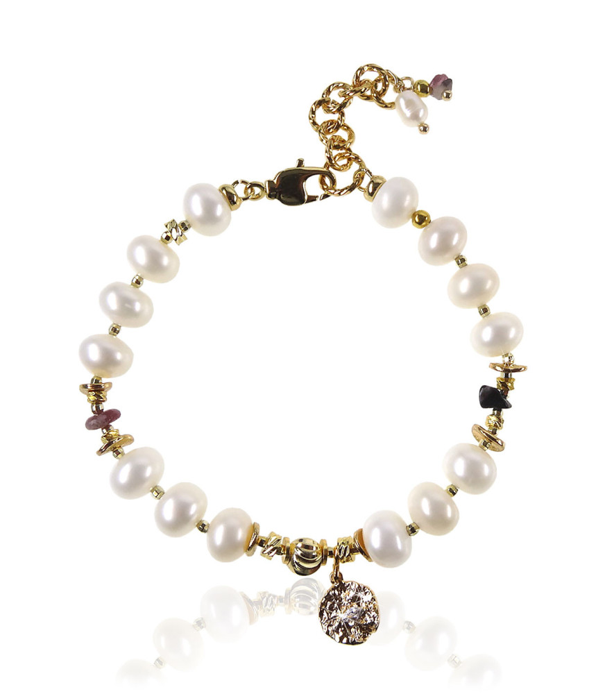 Brillant Bracelet en perles d'eau douce et tourmaline-bracelet avec pendentif charm rond en 24K avec pierre de zircon