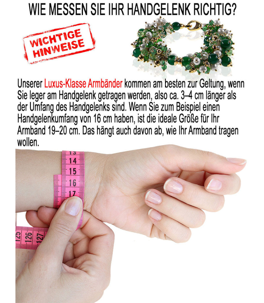 Note importanti: I nostri braccialetti di lusso risaltano al meglio quando vengono indossati in modo casual al polso, quindi circa 3-4 cm più lunghi della circonferenza del polso. Ad esempio, se hai una circonferenza del polso di 16 cm, la dimensione ideale per il tuo braccialetto è di 19-20 cm. Dipende anche da come vuoi indossare il tuo braccialetto.