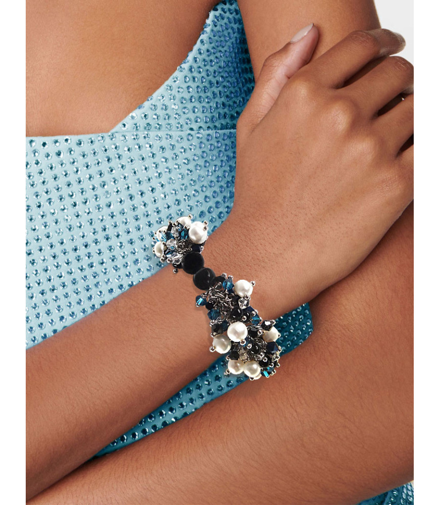 Bracciale fulminante per apparizioni scintillanti! Il magnifico potpourri unisce cristalli di vetro e perle coltivate d'acqua dolce di alta qualità. Sfumature scintillanti di blu cielo, blu scuro, cristallo nero e chiaro, e perle grigie incantano ogni osservatore. Abbina gli orecchini coordinati per momenti glamour. Questo gioiello è realizzato a mano nell'atelier MAGIC-PEARLS. Ogni bracciale è un pezzo unico!